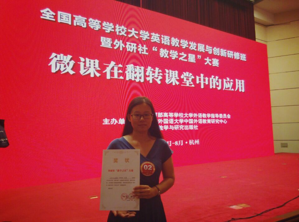 全国高等学校大学英语教学发展与创新研修班暨第三届外研社“教学之星”大赛于近日举行,大赛由教育部高等学校大学外语教学指导委员会、教育部高等学校英语专业教学指导分委员会、北京外国语大学中国外语教育研究中心和外语教学与研究出版社共同举办。大赛旨在切实提升高校外语教学质量,推动我国高校外语师资队伍建设,促进教师专业发展,以适应国家和社会对高校外语教学要求的变化。我校外国语学院教师吕婷参加了此次比赛,最终获得第三届外研社“教学之星”大赛季军。