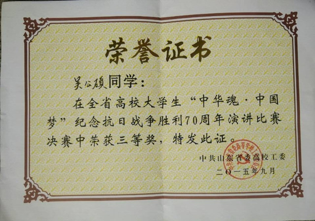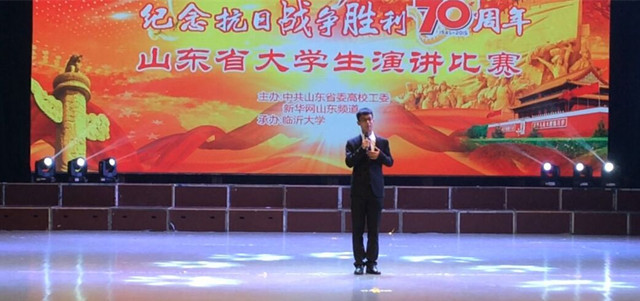 9月25日,由中共山东省委高校工委主办、临沂大学承办的全省大学生“中华魂·中国梦”纪念抗战胜利70周年演讲比赛决赛落下帷幕。我院2014级学生吴公硕代表学校参赛,荣获三等奖。