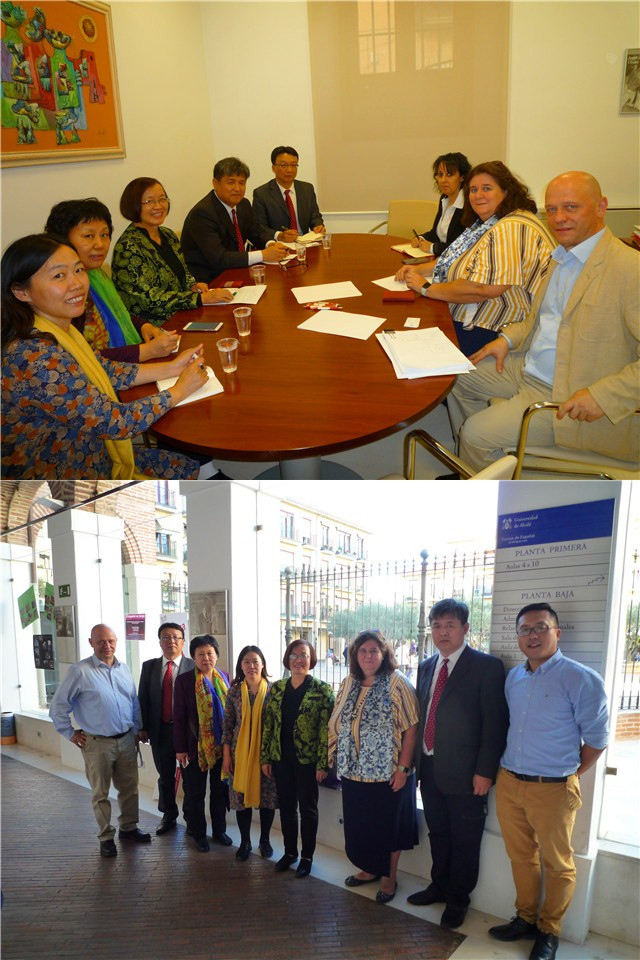 在阿尔卡拉大学访问期间,该校副校长Maria女士会见了我校访问团。双方各自简要介绍了学校的基本情况。阿尔卡拉大学国际关系部主任Gabino,学习部主任Sonia,中国留学生负责人Feng Shi等部门负责人参与了此次会谈,双方均表达了全面加强两校在各领域合作的愿望,特别就我校应用西班牙语专业的“3+1”项目,经济管理、旅游、会计等专业的本科生联合培养项目、互派留学生、短期语言文化交流以及教师访学、读博等方面充分交换了意见,进一步明确了学时、学费、课程、语言、住宿以及入学要求等细节,双方就下一步深化合作,提出了明确的步骤和措施。会谈后,我校访问团参观了阿尔卡拉大学历史悠久的校园。