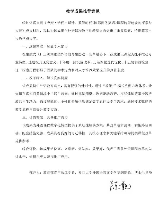 教育部英语类专业教指委委员、商务英语国一流专业负责人李毅教授教学成果推荐意见
