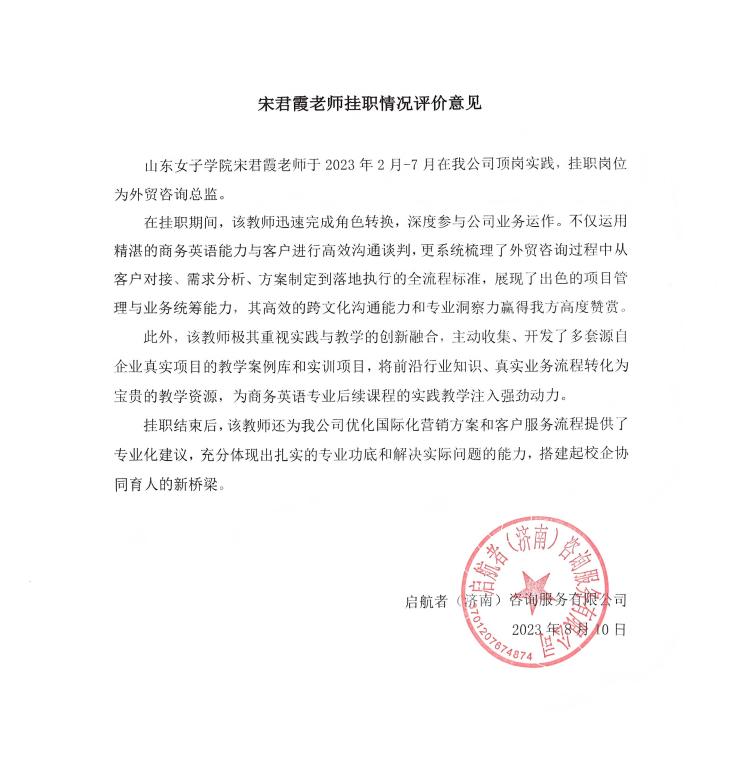 1.宋君霞老师挂职启航者(济南)咨询服务有限公司外贸咨询总监
