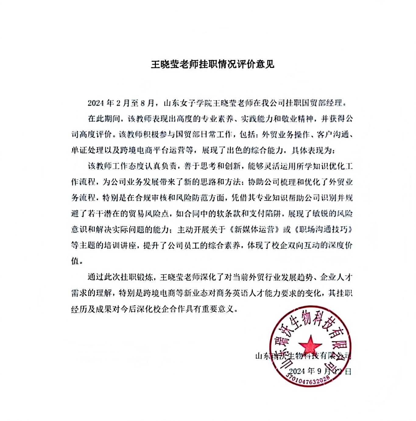 2.王晓莹老师挂职山东瑞沃生物科技有限公司国贸部经理