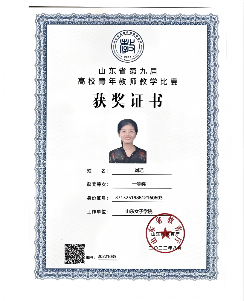 1.刘瑶老师获山东省高校青年教师教学比赛一等奖