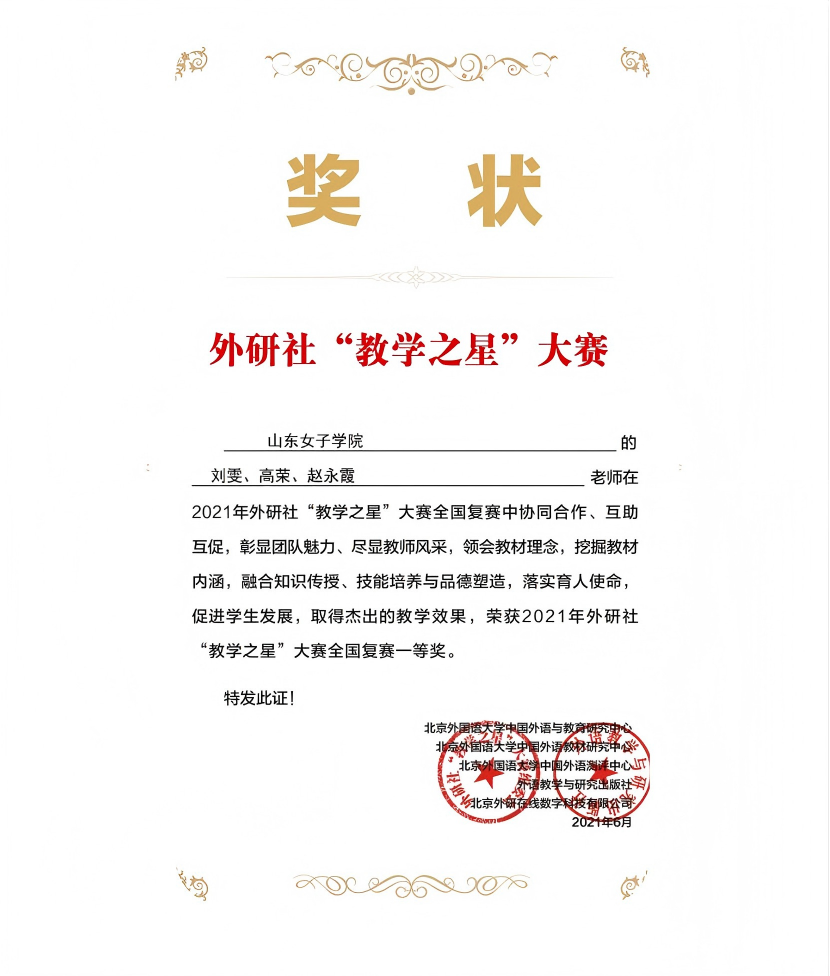 6.刘雯、高荣、赵永霞三位老师获2021年外研社“教学之星”大赛全国复赛一等奖