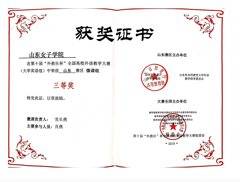 5.党长燕老师获第十届“外教社杯”全国高校外语教学大赛山东省赛区微课组三等奖