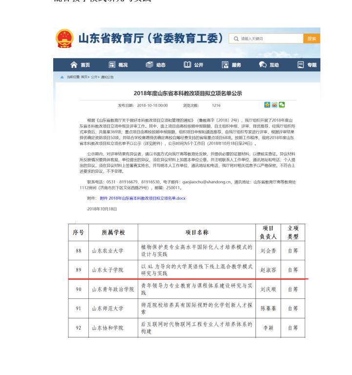 1.山东省高等学校教学改革项目:以AL为导向的大学英语线下线上混合教学模式研究与实践