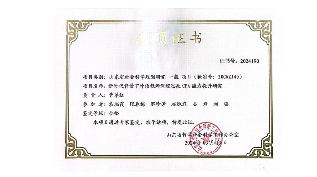 4.山东省社科规划课题:新时代背景下外语教师课程思政CPA能力提升研究