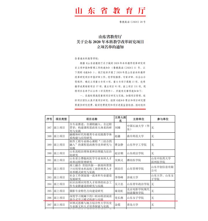 2.山东省高等学校教学改革项目:深度学习视阈下的I-READ英语阅读混合式学习模式构建与实践