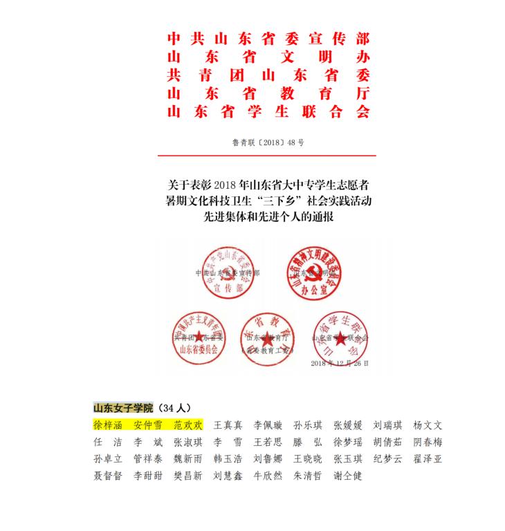 3.徐梓涵等获山东省大中专学生志愿者暑期文化科技卫生“三下乡”社会实践活动先进个人