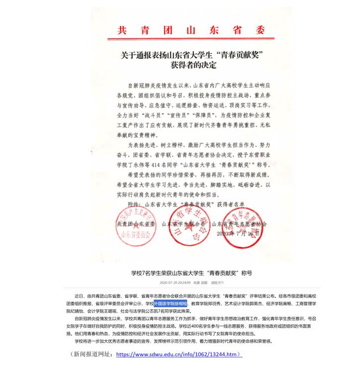 1.徐榕桧同学获山东省大学生“青春贡献奖”