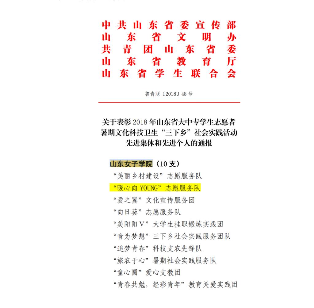 2.“暖心向YOUNG”志愿服务队获山东省大中专学生志愿者暑期文化科技卫生“三下乡”社会实践活动先进集体