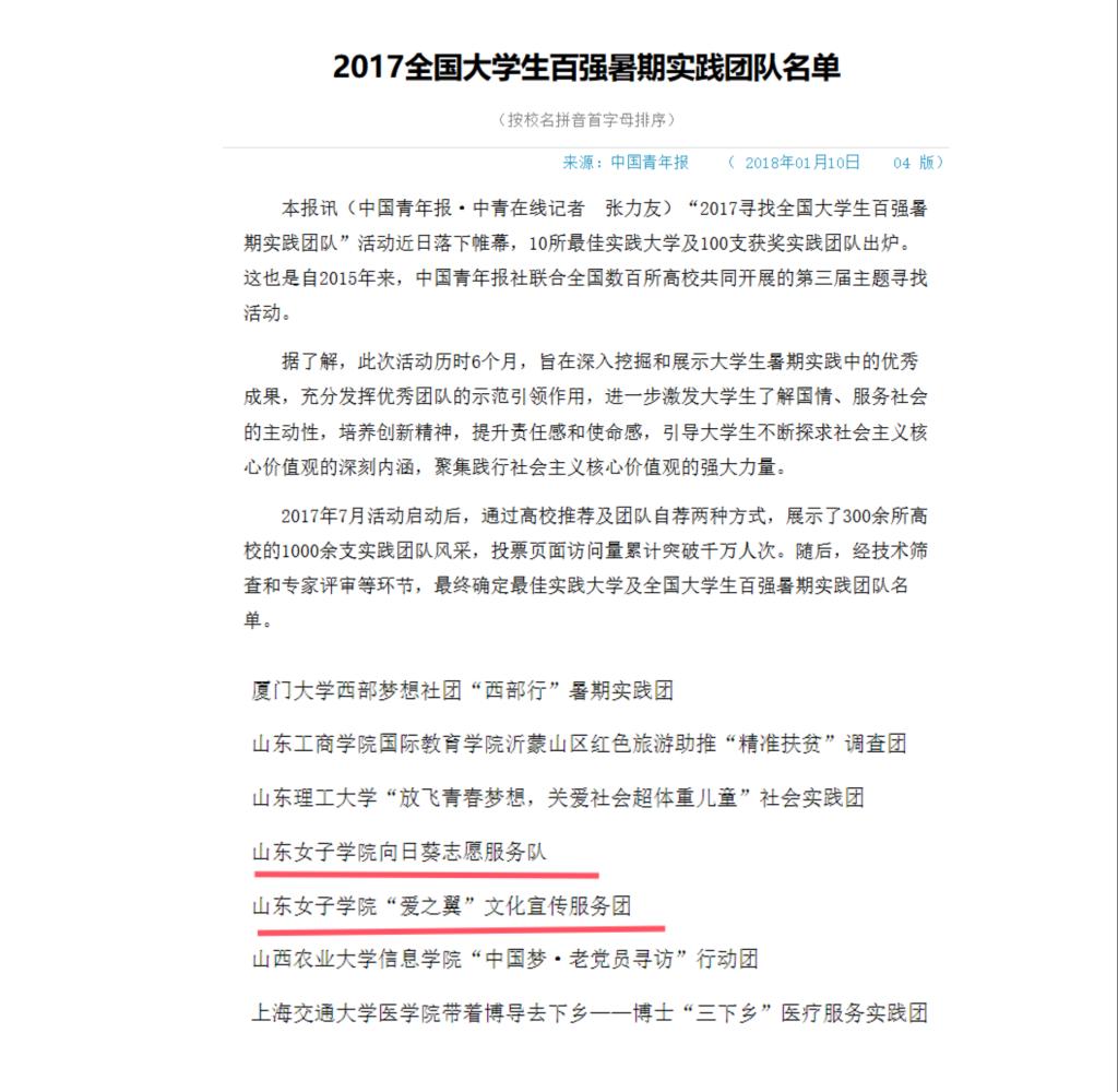 4.山东女子学院向日葵志愿服务队获全国大学生百强暑期实践团体
